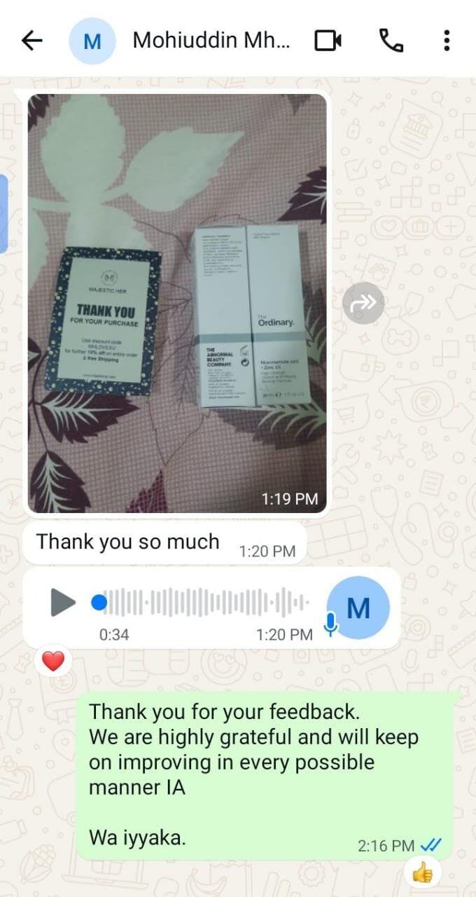 The Ordinary Niacinamide Acid meri skin ke liye ek magic serum sabit hua hai, seriously. Jab se use laga rahi hun, meri skin hydrated aur fresh lagti hai. Fine lines kafi fade ho gayi hain. Mujhe kabhi nahi laga tha ek serum itna effective ho sakta hai. I am thankful to Majestic her team, will recommend them to my friends at uni also.
